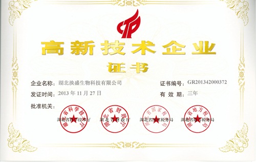 2013年11月27日,湖北省科學(xué)技術(shù)廳、湖北省財政廳、湖北省國家稅務(wù)局、湖北省地方稅務(wù)局聯(lián)合下發(fā)《關(guān)于公布湖北省2013年第二批高新技術(shù)企業(yè)擬認(rèn)定結(jié)果的通知》文件,湖北泱盛生物科技有限公司通過國家高新技術(shù)企業(yè)認(rèn)定,2014年2月19日完成備案工作,于近日下發(fā)了相關(guān)證書,證書編號:GR201342000372,有效期3年。