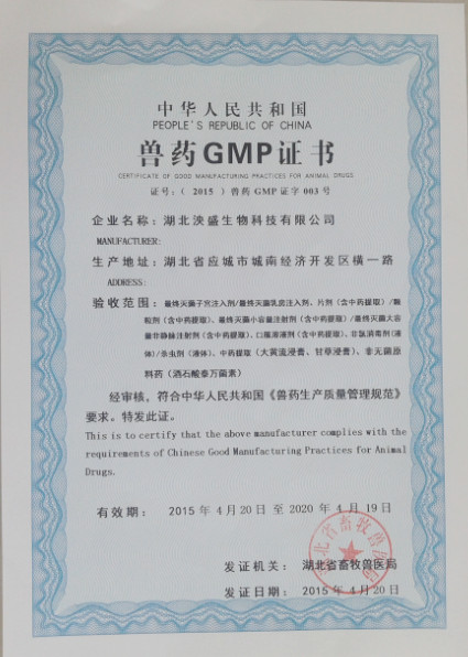 上月,泱盛生物順利通過(guò)農(nóng)業(yè)部專家組的全面GMP現(xiàn)場(chǎng)檢查驗(yàn)收。4月21日,湖北省畜牧獸醫(yī)局向泱盛頒發(fā)了《獸藥GMP證書》及《獸藥生產(chǎn)許可證》。